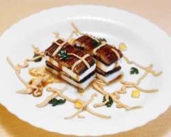 @下から豆腐→蒲焼きの順に積み重ねていく。