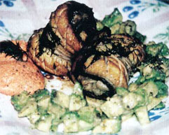 6. スモークうなぎは、たこ糸をほどかないまま器に盛り、(5)のムース、アボガドをサイコロ状に切ってドレッシングであえたも のといっしょに盛り付ける。 黒こしょう・バルサミコを好みでふりかける。赤ピーマンのムースは、ソースのようにつけていた だきます。